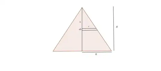 Now, at a height $h$ from the apex of the cone, I considered an infinitesimally small increase in height $dh$. Now, the small increase in volume $dV$ due to the small increase in height $dh$ is given by the volume of the cylinder with height $dh$ and radius r (Note that only half the cylinder is shown in the figure). So,