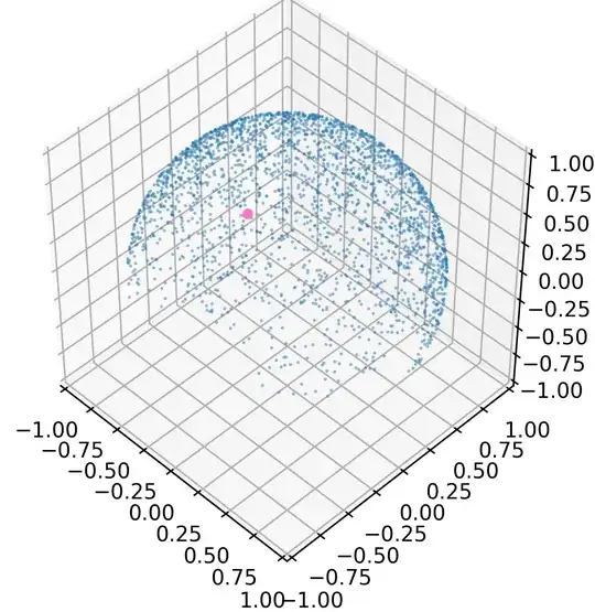 The pink point denotes "initial" point. The blue points are the result of rotating the initial point using 5000 randomly generated 3x3 rotation matrices.