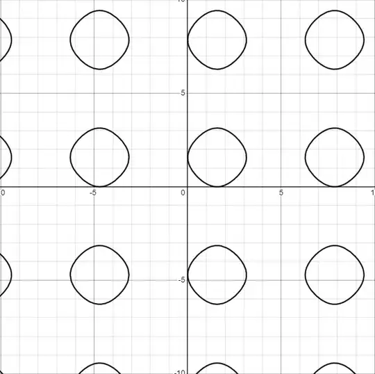 - This area is exactly the same as the area enclosed by each infinitely repeating pattern in the graph $\cos (x) + \cos (y) = 1$