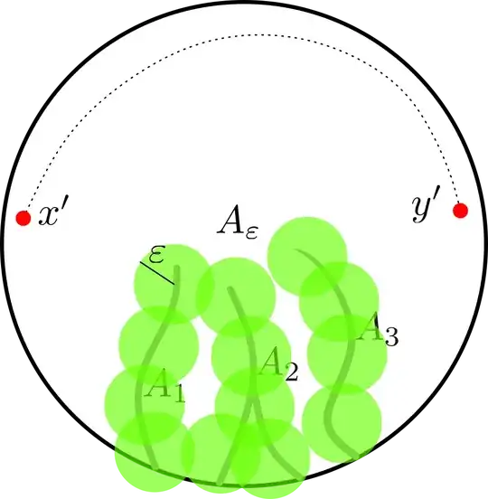 Study of set $D\backslash A_\varepsilon$: Now we'r studying topological property of the connected component of $\stackrel{\circ}{D}\backslash A_\varepsilon$ that contains $x'$, lets call $X$ that open set. Because $A_\varepsilon$ its compact that doesn't intersect the compact $I$, there is a distance $d>0$ between this two disjoint set, so we can construct a path $\gamma$ (near to $I$, inside $X$) that link the two points $x',y'\implies y'\in X$.