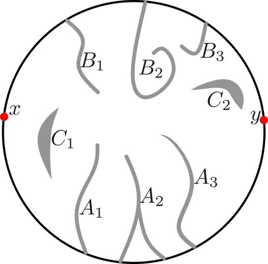 $\phi(B)$ is compact and intersect $I'$ and its disjoint from $J'$ so there exists (like before) a path $\gamma'(t)$ near to $J'$ that links $\phi(x)$ to $\phi(y)$ disjoint from $\phi(B)$, more we can request that $\gamma'(t)$ is disjoint from $\phi(C)$ (it is compact and disjoint from $J'$ too). Finally we get a path $\gamma(t)=\phi^{-1}\circ\gamma'(t)$ in $X$ disjoint from $B$ and $C$, hence a path in $D$ disjoint from $A$,$B$ and $C$ that links $x$ to $y$.