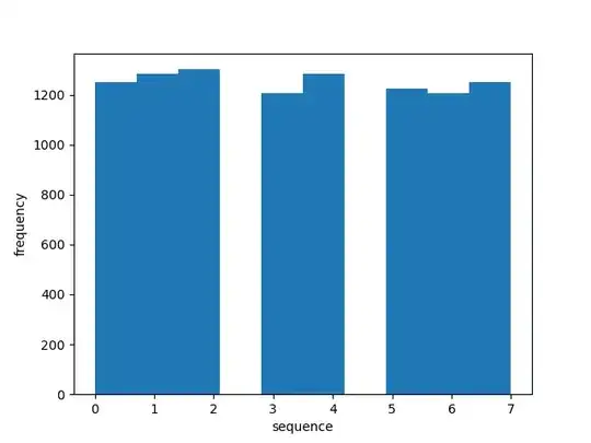 This histogram counts the number of occurrences for each three-letter sequence "DDD" (0), "DDU" (1), "DUD" (2), "DUU" (3), "UDD" (4), "UDU" (5), "UUD" (6), "UUU" (7). If the manga's claim is true, then I should see some kind of normal distribution in the histogram. The histogram clearly shows that each sequence are equally likely, so the manga might be wrong or there is something wrong with my simulation.