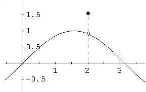 Let this curve be $g(x)$. $\lim\limits_{x\to 2}g(x)$ exists (because if I look at $g(x)$ from the left of $2$ and the right of $2$ it looks like its going to equal about $1$) but it is not equal to $g(2)$, which is actually $1.5$.