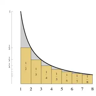 Sum this up from $m = 2$ to $m = n$ to get $\displaystyle\sum_{m = 2}^{n}\dfrac{1}{m} \le \sum_{m = 2}^{n}\int_{m-1}^{m}\dfrac{1}{x}\,dx = \int_{1}^{n}\dfrac{1}{x}\,dx = \ln n$.