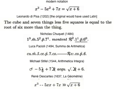 I would like to see a simple example which shows how mathematical notation were evolve in time and space.