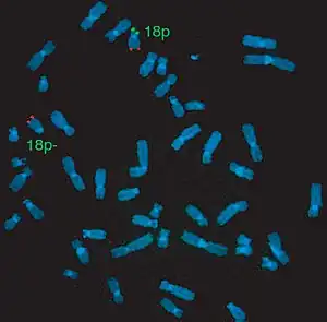 18p- describes a deletion of the short arm of chromosome 18.[1] About half of the people with deletions have a breakpoint at the centromere. Those with it are said to have centromeric 18p-, and those without are said to have non-centromeric 18p-.