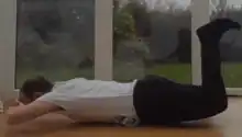 The Superman exercise, involving balancing solely with the abdomen (on a folded towel) while raising the upper torso and pelvis off the floor with the limbs bent. There are numerous variations.[5]