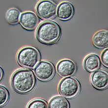 In nature, the fungus forms a network of thread-like mycelium that penetrates the substratum on which it grows, and then after 3–5 days of growth begins to reproduce asexually with small (2–10 µm) conidia (asexual spores). These conidia are probably the main infectious particles produced by the fungus. They form on individual short stalks and readily become airborne when the colony is disturbed; their size places them well within the respirable size range for particles,[8] meaning that they can deposit deeply in the lungs when inhaled. Sexual reproduction by the fungus requires the meeting of colonies of + and – mating type, probably a relatively rare event, and results in the production of small ascomata (sexual fruiting bodies) 200–350 µm, looking, to the naked eye, similar to a woollen fuzz ball, and in microscopic view consisting of a layer of spiralling, springy guard hairs surrounding a fertile core in which groups of 8 ascospores (sexual spores) are produced in small round reproductive sacs (asci). The ascospores, at 1.5–2.0 µm, are among the smallest reproductive particles produced by fungi, and are within the respirable size range.[8] The budding yeast cells seen in infected tissues and bodily fluids are generally relatively large (c. 8–15 µm) and characteristically bud through a broad base or neck, making them highly recognizable to the pathologist. A small ("nanic") form is rarely seen with cells under 6 µm.