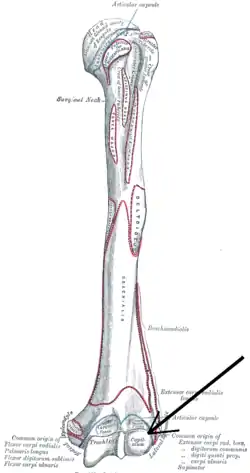 ![]() Left humerus seen from front (capitulum visible at bottom right) | |