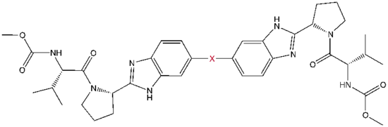 - 1 2 3 Lemm, J. A.; Leet, J. E.; O'Boyle, D. R.; Romine, J. L.; Huang, X. S.; Schroeder, D. R.; Alberts, J.; Cantone, J. L.; Sun, J.-H.; Nower, P. T.; Martin, S. W.; Serrano-Wu, M. H.; Meanwell, N. A.; Snyder, L. B.; Gao, M. (16 May 2011). "Discovery of Potent Hepatitis C Virus NS5A Inhibitors with Dimeric Structures". Antimicrobial Agents and Chemotherapy. 55 (8): 3795–3802. doi:10.1128/AAC.00146-11. PMC 3147613. PMID 21576451.