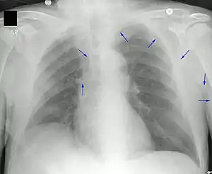 Chest X-ray showing tip of PICC line in the superior vena cava. Arrows provided to highlight the PICC line.