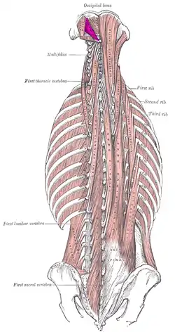![]() Deep muscles of the back. (Rect. post. major visible at upper left.) | |