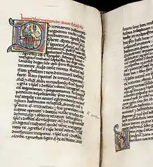 Image of two facing pages of the illuminated manuscript of "Isagoge", fols. 42b and 43a. On the top of the left hand page is an illuminated letter "D" – initial of De urinarum differencia negocium ('The matter of the differences of urines'). Inside the letter is a picture of a master on bench pointing at a raised flask while lecturing on the "Book on urines" of Theophilus. The right hand page is only shown in part. On its very bottom is an illuminated letter "U" – initial of Urina ergo est colamentum sanguinis ('Urine is the filtrate of the blood'). Inside the letter is a picture of a master holding up a flask while explaining the diagnostic significance of urine to a student or a patient. HMD Collection, MS E 78.
