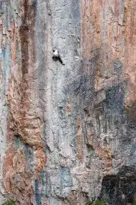 Contrary to what you might think, the best angle for the screws is slightly upward, meaning the hanger is slightly lower than the teeth in the ice. This counterintuitive method is better because the holding power comes from the threads themselves and not from a “snow picket” effect, meaning you don’t get any mechanical advantage having the shaft of the screw levered against the ice (Fig. 2).
