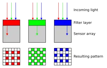 Another alternative that is employed by some expensive professional video cameras is to have three entirely separate sensors, one for each of red, green and blue, and use a light splitter to throw the same image on all three of them. Obviously this cannot exist in a DSLR or compact camera or any normal type of consumer stills camera. But it can explain why pixel counts on the sensors of professional video cameras can't be compared to those on DSLRs.