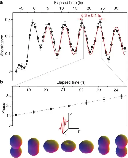 The absorbtion data therefore shows a clear oscillation as a function of the delay between the two pulses: