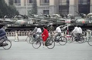 Although Chinese leader Deng Xiaoping embraced and pushed for economic liberalization during the latter 1970s and 1980s,[3] the Chinese Communist Party (CCP) still resisted calls for political reform. In this atmosphere of rapid change, a popular youth and student movement across the nation developed to call for, among other things, democratization, freedom of speech, and freedom of press.[4] As the protests grew in popularity, the Chinese leadership became increasingly impatient with what they perceived to be a political threat. Matters came to a head when communist authorities declared martial law on May 20th, 1989 and later, on June 3rd, dispatched an estimated 300,000 soldiers to Tiananmen[5] with orders to forcefully remove the protesters. This action involved the use of automatic weapons on the demonstrators, which killed at least several hundred people[6] and possibly as many as 10,000.[7]