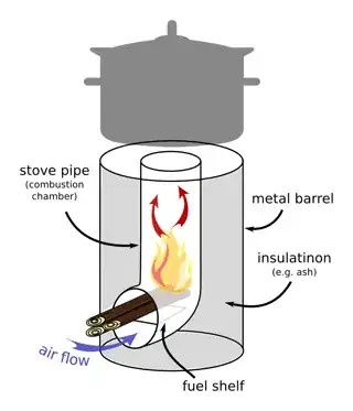 To create a functioning rocket stove, you need an insulated J-shaped chimney. Like this: