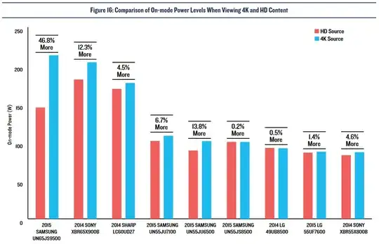 Next, the authors compared energy consumption on the same TVs for HD vs 4K content: "Feeding a 4K television, a higher-resolution (4K) version of HD video material did tend to increase energy use by an average of 10 percent, but there were large differences between models." Figure 16 illustrates this: