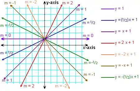 For completely horizontal lines, the difference in y coordinates between any two points is 0, so the slope m = 0, indicating no steepness in the line at all. If the line extends between right-upper (+,+) and left-lower ( -, -) directions, then the slope is positive. As the slope increases, the line becomes steeper until the line is almost vertical when the slope is very large. When the slope m = 1, the line is diagonal with an angle halfway between the x and y axes. If the line extends between left-upper (-,+) and right-lower (+, -) directions, then the slope is negative. As the slope changes from 0 to very negative numbers, the steepness in the opposite direction increases. Compare the slope ( m ) values in the following graph of functions y = 1 (where