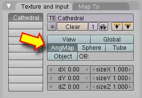 - In the "Texture and Input" tab, click "Add New" and "Angmap". Note that the Angmap button is the important thing to tell Blender that this file is a Light Probe file !