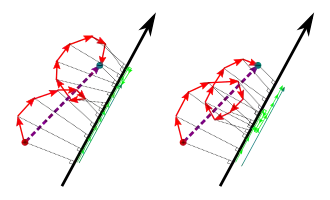 ![]() Given an arbitrary oriented path, the total displacement covered by the perpendicularly projected path onto an oriented straight line does not depend on the placement of the interior points of the path. The displacement only depends on the endpoints. Since this is true no matter the choice of straight line, the total 3D displacement vector generated by an oriented curve is purely a function of its endpoints, and does not change if the interior points are moved. |
