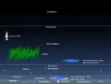 Space Shuttle Endeavour appears to straddle the stratosphere and mesosphere in this photo. The troposphere, which contains clouds, appears orange in this photo.[1]