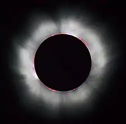 If you have a telescope with special filters, you can see bumps around the edge of the Sun. Each one of these is called a prominence. They look like volcanoes erupting. They are hundreds or thousands of kilometers long. Some are bigger than the Earth. They often seem to come from sunspots. Sometimes they get so far away from the Sun that they fly away from it. Then they are called solar flares.