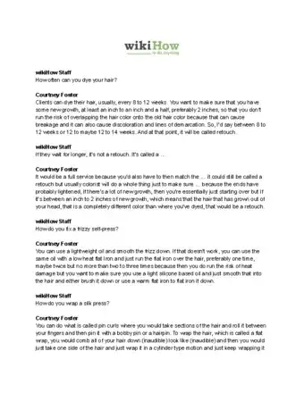 This article was co-authored by Courtney Foster. Courtney Foster is a Licensed Cosmetologist, Certified Hair Loss Practitioner, and Cosmetology Educator based out of New York City. Courtney runs Courtney Foster Beauty, LLC and her work has been featured on The Wendy Williams Show, Good Morning America, The Today Show, The Late Show with David Letterman, and in East/West Magazine. She received her Cosmetology License from the State of New York after training at the Empire Beauty School - Manhattan.