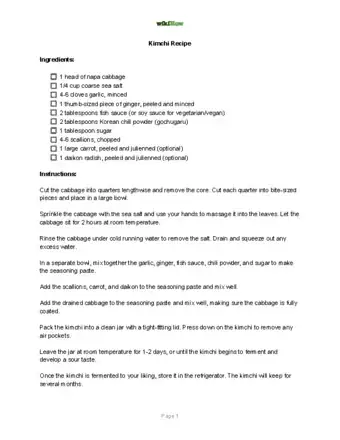 To make kimchi, first thoroughly wash your hands so you don't transfer bacteria to any of the ingredients since bacteria can disrupt the kimchi’s fermentation process. Then, cut a head of napa cabbage lengthwise into quarters. Cut each quarter into small vertical strips. Set the cabbage in a mixing bowl and add ¼ cup (60 g) of non-iodized salt. Massage the salt into the cabbage and let it sit for 2 hours. Next, rinse the cabbage under lukewarm water for a few minutes to remove the excess salt. Dry the cabbage off with paper towels. Now, peel 7 garlic cloves and place them inside a clean food processor. Add a peeled stalk of ginger roughly 3-4 inches (7.5-10 cm) in length, 1 tablespoon (4 g) of sugar, and 3 tablespoons (30 mL) of fish sauce. Blitz the ingredients on high for 30 seconds until the texture is smooth. Then, pour in 1-5 tablespoons (5-25 g) of Korean red pepper flakes based on how spicy you like your kimchi. Stir the ingredients in your processor to make sure they’ve combined. Next, chop the cabbage up into bite-sized pieces and place them in a clean mixing bowl. Peel an 8-ounce (230 g) daikon radish and dice it up into thin strips. Add the radish to your mixing bowl. Then, cut 4 green onions into 1-inch (2.5 cm) pieces and throw them in the bowl as well. Pour the pepper paste from the food processor on top of your ingredients and mix everything together with a spoon. Now, pack the mixture into a clean glass jar as densely as you can while leaving a little space at the top. Seal the jar with a lid and leave it out at room temperature in a dark part of your home for 2-5 days to ferment. The longer you let it ferment, the sourer and softer the kimchi will be. If you wait 2 days, the kimchi will be crunchy and sweet, while waiting 5 days will result in soft and sharp kimchi. Once you’re done letting it ferment, place your kimchi in the refrigerator to stop the fermentation process and store it. Your kimchi will last for 2-3 months. For specific ingredients and measurements, read on!