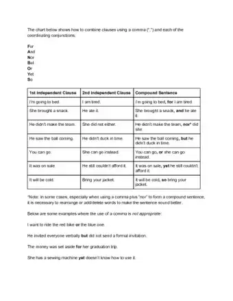 • Coordinating conjunctions include: and, but, yet, nor, or, for, so.