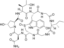 γ-Amanitin (gamma-Amanitin) is a cyclic peptide of eight amino acids. It is an amatoxin, a group of toxins isolated from and found in several members of the mushroom genus Amanita, one being the death cap (Amanita phalloides) as well as the destroying angel, a complex of similar species, principally A. virosa and A. bisporigera. The compound is highly toxic, inhibits RNA polymerase II, disrupts synthesis of mRNA, and can be fatal.[1]