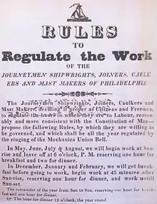 In the United States during the first decades of the nineteenth century, "strikes constituted illegal conspiracies under common law, exposing labor to criminal prosecution".[23] Although rarely enforced, strikes, sometimes led local authorities to call out the militia.[24] Federal employee organizations were in their infancy and mostly limited to charitable endeavors. On the Washington Navy Yard, the first such organization was the Navy Yard Beneficial Society founded in 1804. While not representing workers' economic interests, the society did provide members with a nominal sum of fifty cents per pay period, the assurance of a decent funeral, and financial assistance to their spouse and minor children. Records regarding the Navy Yard Beneficial Society are scarce. However, early employee obituaries prove that it was very active as a charitable group from 1804 to the 1860s.[25] The workday in all federal navy yards prior to 1835 was sunrise to sunset, with time off for breakfast and lunch. In May 1835, the Boston carpenters issued their famous "Ten Hour Circular", advocating a ten-hour day which found wide distribution throughout the major cities on the eastern seaboard and the District of Columbia and quickly became a rallying cry for reducing the length of the working day.[26]