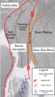 Burma is wedged between four tectonic plates; the Indian, Eurasian, Sunda and Burma plates that interact due to active geological processes. Along the west coast of the Coco Islands, off the Rakhine coast, and into Bangladesh, is a highly oblique convergent boundary known as the Sunda megathrust. This large fault marks the boundary between the Indian and Burma plates. The megathrust emerges from the seafloor in Bangladesh, where it runs parallel and east of the Indo-Burman Range. This boundary continues to north of Burma where it ends at the eastern Himalayas.[5] The oblique convergent boundary is seismically active, responsible for large earthquakes and tsunamis in 1762, 1842, 1843, 1848, and 1858.[6][7] Some of these earthquakes, such as the 1762 event, has resulted in great coastal uplift.[7] In the case of the 1762 earthquake, rupture occurred on the megathrust interface and on splay faults. Another earthquake in 1848 ruptured a splay fault.[6] Oblique convergence is also accommodated by large right-lateral and thrust faults inland, in the Central Burma basin, including the Sagaing Fault.[5]