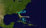 Early on August 14, the ship Tybee reported hurricane-force winds to the east of The Bahamas, signaling the presence of a well-formed system. At 00:00 UTC on August 14, the third tropical cyclone of the season was noted, 210 mi (340 km) northeast of San Salvador Island, with 90-mph (150-km/h) winds. Tracking generally westward, the hurricane gradually strengthened. At 12:00 UTC on August 15, the cyclone attained peak winds of 115 mph (185 km/h)—equivalent to Category 3 status on the modern Saffir–Simpson scale, which it maintained until landfall in Florida. Several hours later, the hurricane crossed the northern Abaco Islands and continued westward toward the Gulf Stream. Early on August 16, a barque, the Bridgeport, measured a pressure of 952 mbars (28.1 inHg) in the storm's eye.[3] As it neared eastern Florida, the storm curved slightly west-northwestward, before making landfall north of Hobe Sound at 02:00 UTC on August 17.[6] Over the next few days, the cyclone parabolically turned to the northeast, re-entering the Atlantic near Darien, Georgia, on August 18. While executing a clockwise loop off the Southeastern United States, the system maintained winds just below hurricane intensity. On August 22, the system ended its loop and headed westward, toward the Georgia coast. Final landfall occurred near Brunswick at 00:00 UTC on August 23. At the time, the cyclone still contained winds of 70 mph (110 km/h). The system decayed as it moved inland, and dissipation took place 18 hours later.[6]