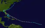 On August 17, the fourth tropical storm of the season developed 550 mi (885 km) west-southwest of the Cape Verde islands. The system progressed on a west-northwest track and steadily intensified, becoming a major hurricane at 00:00 UTC on August 21. Bearing peak winds of 115 mph (185 km/h), the hurricane passed over Antigua, Sint Eustatius, Saint Kitts, and Saint Thomas. Continuing northwestward, it passed 30 mi (50 km) northeast of Fajardo, Puerto Rico.[16] The hurricane then weakened to a Category 2 hurricane, maintaining this strength while making further landfalls in the Bahamas. At 05:00 UTC on August 25, the storm struck near present-day Vero Beach, Florida, with winds of 105 mph (165 km/h).[17] After crossing Central Florida, it entered the Gulf of Mexico and made a final landfall on Taylor County, Florida, as a tropical storm. The storm then moved north and east over land, weakening into a tropical depression, before strengthening back into a tropical storm after re-emerging into the Atlantic off South Carolina. At 12:00 UTC on August 30, the cyclone reattained winds of 70 mph (110 km/h). The storm was last sighted 90 mi (145 km) east of Cape Cod.[6]