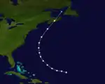 A hurricane was first observed northeast of the British Virgin Islands on the morning of October 10. At this point it was already a Category 1 hurricane with winds of 80 mph (130 km/h). Its intensity remained steady at that level as it traveled first west, then veered north before travelling parallel to the US coast. The hurricane dissipated shortly after making landfall at Nova Scotia on October 13.[6]