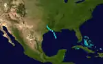 A tropical storm was first observed in the Gulf of Mexico on September 14. Its prior track is unknown, but it moved to the west-northwest, and hit land at the mouth of the Sabine River near the Texas/Louisiana border on September 15. Port Eads, Louisiana recorded winds of 70 mph and a pressure of 29.38 inches.[7] The storm brought a 3-foot (0.91 m) storm surge to Sabine Pass, causing moderate damage, and injured one person.[8]