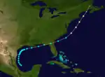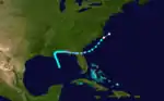 A tropical storm formed in the central Gulf of Mexico on September 24. It drifted northward, and hit southeastern Mississippi before turning eastward. It moved across the Florida panhandle and peninsula, and became a hurricane to the southeast of North Carolina on October 2. Its track after this point is unknown.[2]