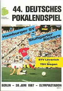 The 1987 DFB-Pokal Final decided the winner of the 1986–87 DFB-Pokal, the 44th season of Germany's premier knockout football cup competition. It was played on 20 June 1987 at the Olympiastadion in West Berlin.[2] Hamburger SV won the match 3–1 against second division Stuttgarter Kickers to claim their third cup title.