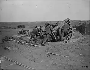 In April 1917 142nd Heavy Bty supported the Canadian Corps' successful attack on Vimy Ridge as part of the Arras Offensive. Maximum use was made of observation balloons and aircraft to pinpoint opposing batteries for the heavies' CB fire.[46][47][50][51][52] The battery rejoined Fifth Army on 1 September in time for the Battle of the Menin Road Ridge and subsequent battles of the Flanders Offensive. By the final Second Battle of Passchendaele conditions for the British artillery were very bad: batteries were clearly observable and suffered badly from CB fire, while their own guns sank into the mud and became difficult to aim and fire.[46][47][48][53]