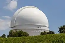The Hale Telescope is a 200-inch (5.1 m), f/3.3 reflecting telescope at the Palomar Observatory in San Diego County, California, US, named after astronomer George Ellery Hale. With funding from the Rockefeller Foundation in 1928, he orchestrated the planning, design, and construction of the observatory, but with the project ending up taking 20 years he did not live to see its commissioning. The Hale was groundbreaking for its time, with double the diameter of the second-largest telescope, and pioneered many new technologies in telescope mount design and in the design and fabrication of its large aluminum coated "honeycomb" low thermal expansion Pyrex mirror.[1] It was completed in 1949 and is still in active use.