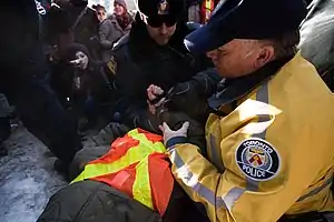 A CUPE 3903 picketer is arrested during a protest against back to work legislation on January 26th, 2009. It was one of the final sizable protests before the end of the strike
