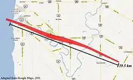 Crossing Kings Highway 21, the tornado moved into the easternmost residential areas of Goderich, north of Elgin Street. More homes sustained significant damage here, with most of those affected receiving some form of roof or window damage. Those with clapboard siding had pock marks and some of their paint stripped. Other homes lost vast portions of their roofs and commercial buildings near Oxford Street and Maitland Road had partial roof removal and exterior wall damage. Some of these walls partially collapsed, crushing more vehicles. Timber power poles were snapped, and concrete light posts were partially toppled near this location. Moving to the east-southeast, the tornado left Goderich, on its way toward the hamlet of Benmiller approximately 8 kilometres away. Now emerging from the rain curtains as a menacing, stovepipe-shaped funnel, and roughly following the Maitland River, the tornado's path widened.[14] In this mostly rural area, there was extensive tree damage in a swath about 1 kilometre wide. Passing through Benmiller it caused extensive damage to several more structures, including the Benmiller Inn. Large swaths of trees were downed on both sides of the Maitland River, as well as in town. Witnesses also reported that the tornado briefly reversed the river's flow as it approached (Cooper and Cove, 2011). Structural debris from Benmiller was deposited into the river, and the damage became more erratic as the tornado crossed uneven terrain; structures on higher ground were more severely damaged.