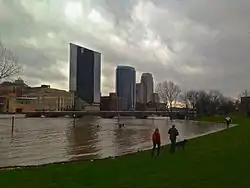 The Grand River crested to a record 21.85 feet, breaking a 1985 river crest record, forcing evacuations and flooding downtown Grand Rapids.[49] 9.1 inches (230 mm) of rainfall fell in Grand Rapids on April 18, breaking the previous rainfall record set in 1909.[50] Sandbags were set up in downtown Grand Rapids along the Grand River, and 1,000 people were evaucated from the Plaza Towers.[51] The Grand Rapids Public Museum was shut down after floodwaters surrounded the museum, despite sandbags that were set up around the building.[52][53] The Grand River also flooded areas of Lowell and Ada Township and prompted evacuations in Wyoming for 25 homes.[31][54][55] Buck Creek was flooded, leading to evacuations across Grandville,[56] and minor flooding occurred along the Saginaw River.[57] Parts of Shiawassee National Wildlife Refuge was flooded, and water topped the dike at Misteguay Creek in Saginaw County.[15] Homes and businesses along the Tittabawassee River were flooded.[15] Grand Rapids mayor George Heartwell declared a local state of emergency after low-lying areas in the city were inundated, forcing people to evacuate.[58]