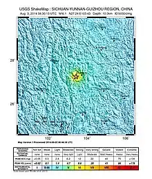The Ludian earthquake occurred at 16:03, Beijing time (08:03 UTC), on 3 August 2014. American geological surveys indicated that the epicenter was 29 km (18 mi) WSW of Zhaotong city at a depth of 10.0 km (6.2 mi),[18] in the quake-prone province of Yunnan in southwestern China, about 18 km (11 mi) from Zhaotong. It was especially felt in the province of Yunnan, and less in the provinces of Guizhou and Sichuan.[19]