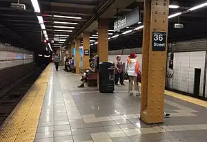 In June 1980, new telephones were installed on the platform at this station and nine others in Brooklyn, following a request by the New York City Council for their installation in crime-prone subway stations.[27] The MTA added funding for a renovation of the 36th Street station to its 1980–1984 capital plan in 1983.[28] In April 1993, the New York State Legislature agreed to give the MTA $9.6 billion for capital improvements. Some of the funds would be used to renovate nearly one hundred New York City Subway stations,[29][30] including 36th Street.[31] The station was overhauled from 1996 to 1997.[32] The changes included retiled walls,[33] rebuilt staircases, new tiling on the floors, upgrading the station's lights, installing ADA yellow safety treads along the platform edge, and new track-beds for local and express trains. It also included an art installation by Owen Smith called An Underground Movement: Designers, Builders, Riders. It features ceramic mosaics on mezzanine and stairway walls, and depicts the workers that have made the subway system possible.[34]