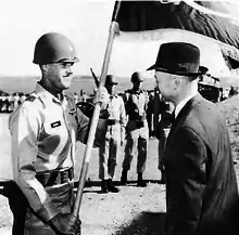 The 2nd Missile Battalion, 44th Artillery Regiment was the first Pershing 1 missile battalion in June 1962 under the 1st Field Artillery Missile Brigade at Fort Sill, Oklahoma.[10] Lt. Col. Patrick W. Powers took command on 13 October 1962, receiving the colors from Dr. Finn J. Larsen, assistant secretary of the Army.[11] On 1 September 1971 the 2/44th was deactivated and reformed as the 3rd Battalion, 9th Field Artillery Regiment.