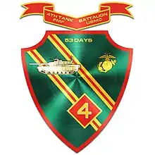 The coat of arms of the 4th Tank Battalion consists of a green jousting shield bordered gold with two bendlets of gold each bearing a riband of scarlet. It is charged with a gold tank icon, initially the M5 Stuart and later the M1A1 Abrams, behind the insignia of the Fourth Marine Division with a U.S. Marine Corps emblem of silver and gold in the shields upper left. The crest of a U.S. Marine Corps emblem of silver and gold above a wreath (or heraldic torse) of gold and scarlet is above the shield. A gold banner inscribed "Fourth Tank Bn" appears above the arms and another below the arms inscribed "53 Days" in scarlet.