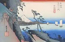 The 53 Stations of the Tōkaidō (東海道五十三次, Tōkaidō Gojūsan-tsugi) are the rest areas along the Tōkaidō, which was a coastal route that ran from Nihonbashi in Edo (modern-day Tokyo) to Sanjō Ōhashi in Kyoto.[1] There were originally 53 government post stations along the Tōkaidō, where travelers had to present traveling permits at each station if wanting to cross.